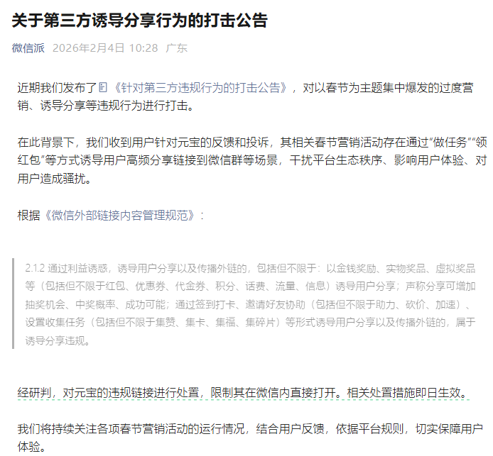 微信方面表示,近期收到用户针对元宝的反馈和投诉,其相关春节营销活动存在通过“做任务”“领红包”等方式诱导用户高频分享链接到微信群等场景,干扰平台生态秩序、影响用户体验、对用户造成骚扰。经研判,对元宝的违规链接进行处置,限制其在微信内直接打开。相关处置措施即日生效。
